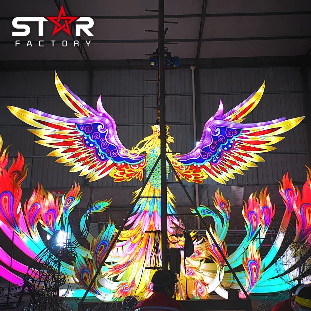 The Giant Phoenix Lantern is a large illuminated sculpture. It adds a bright and colorful element to events, parks, and public spaces. The design is inspired by the legendary phoenix, a symbol of renewal and strength.